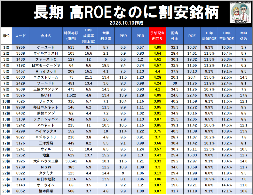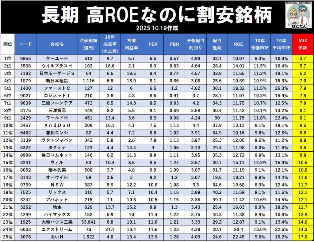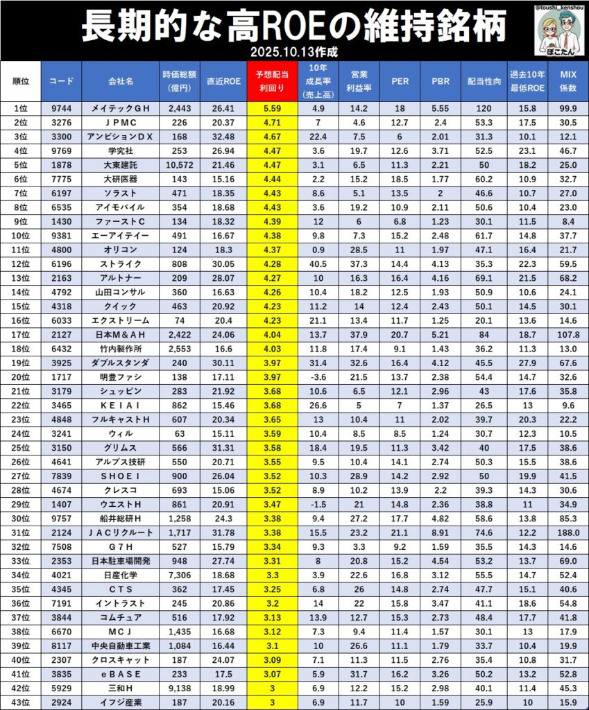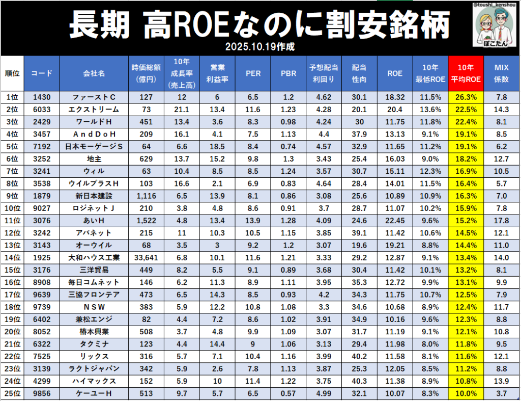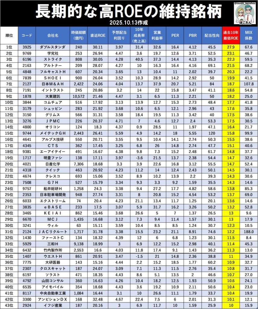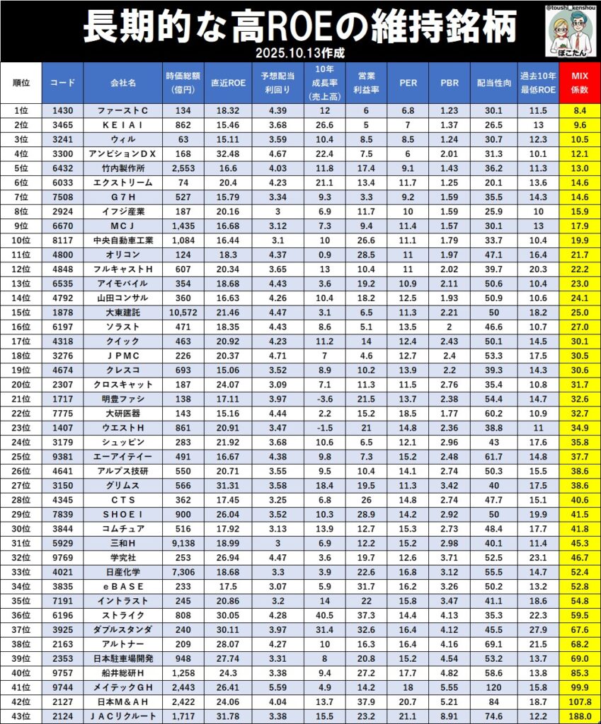 そこでこの記事では、バフェット氏の銘柄選定基準に基づいてスクリーニングした日本株を、各種指標とともに一覧で紹介します。これを見れば、利益成長力が高く、効率的に稼ぐ力を持つ優良企業から投資先を選べるようになります。