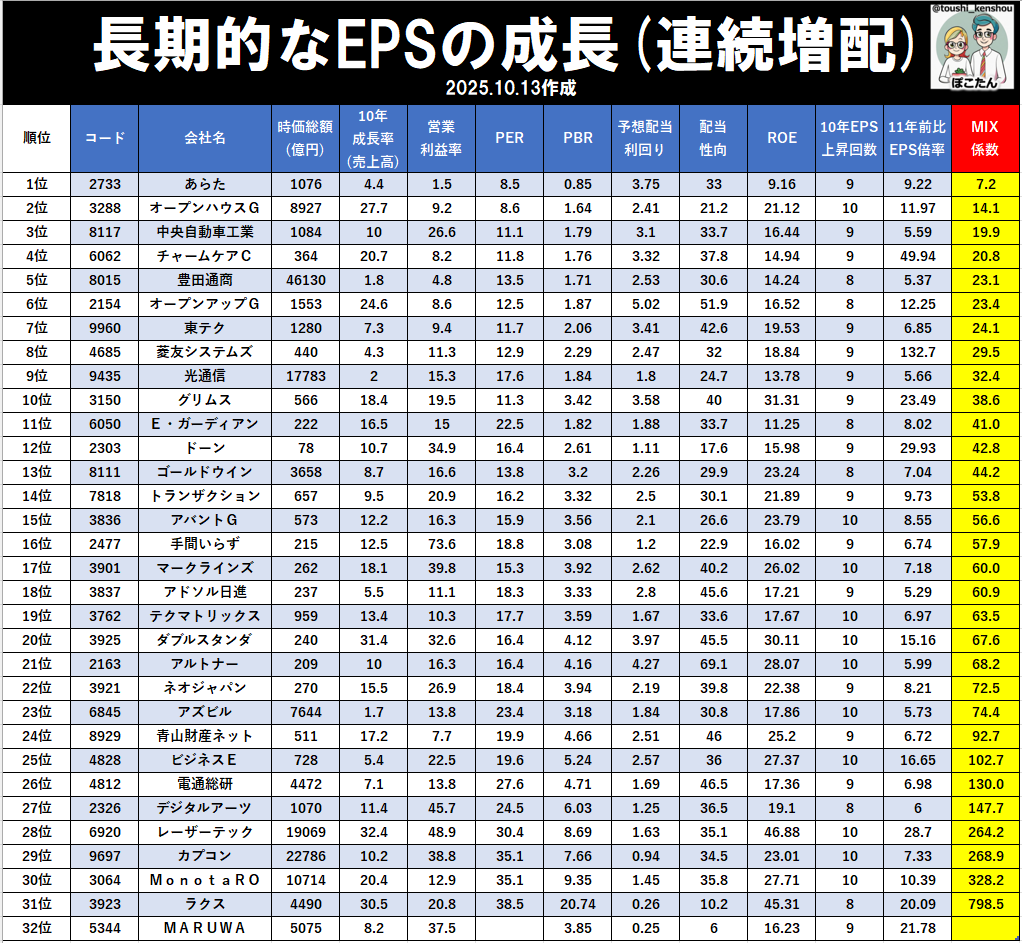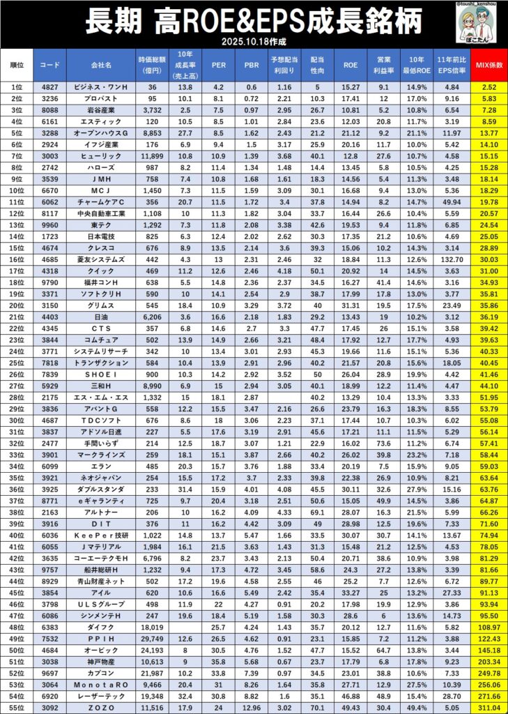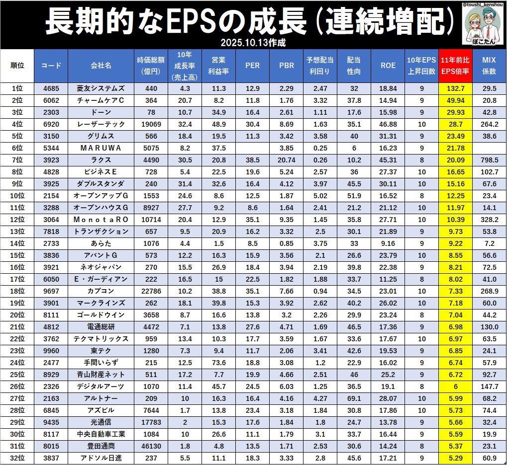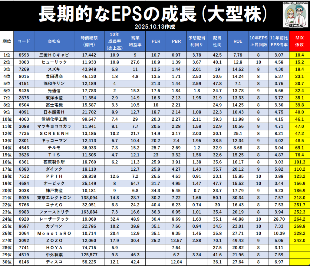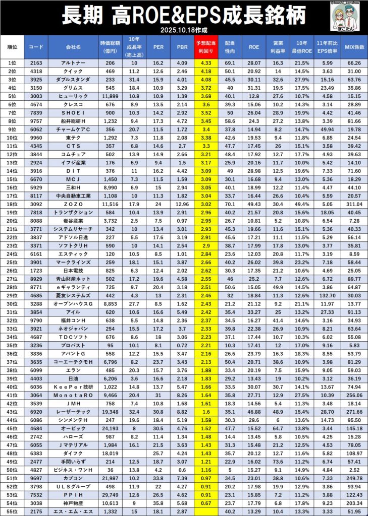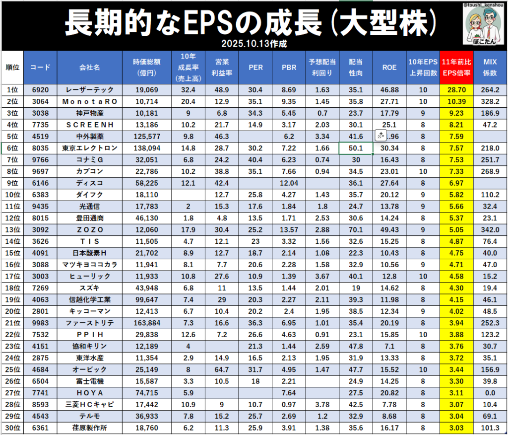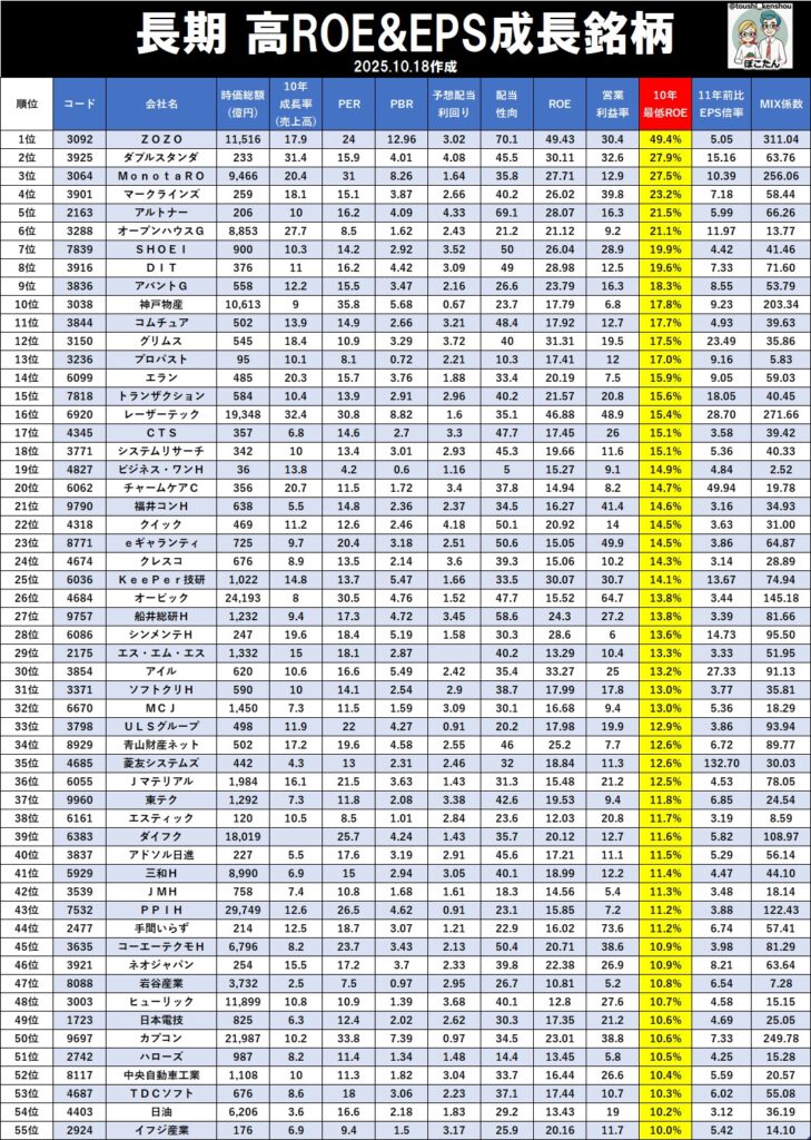 実際に、バフェット流の条件(長期的な高ROE維持、EPSの成長)でスクリーニングした結果を表形式で公開。気になる銘柄をすぐにチェックできます。